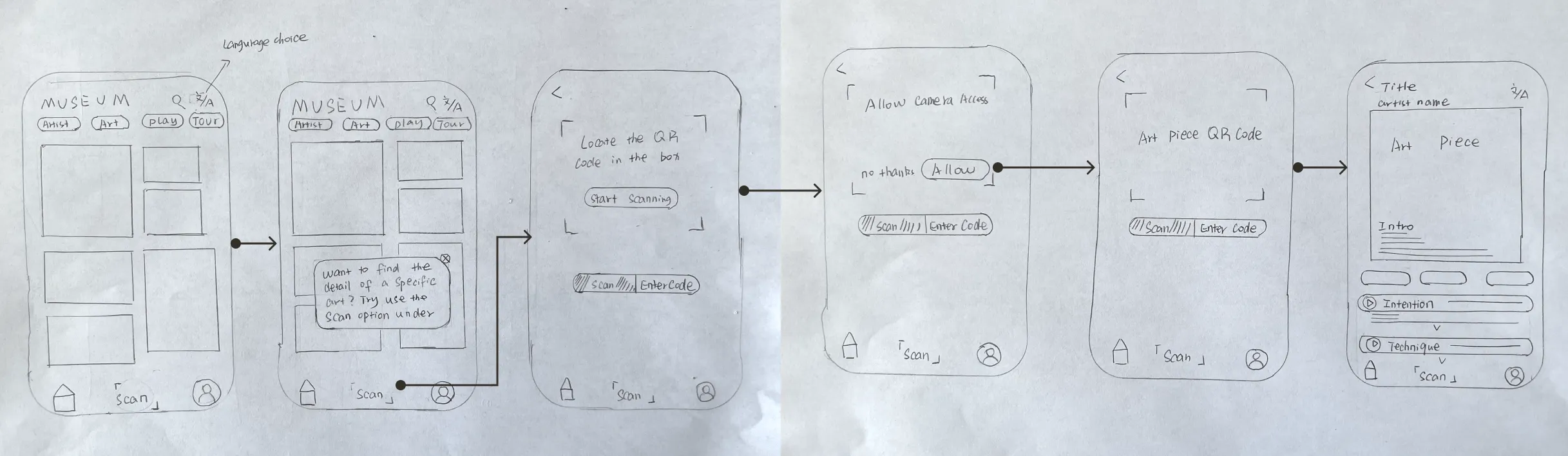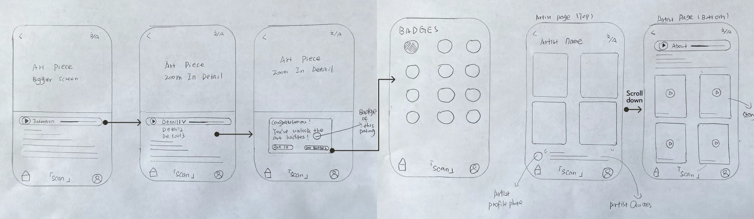With the objective of discovering the artist and the art piece in mind, I create an end-to-end user flow storyboard to visualizing the steps of user’s interaction with the product.